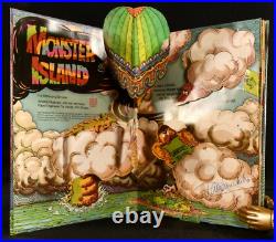 A charming children's pop-up book, following Fred and Lucy as their balloon crashes into the sea off Monster Island, where they see some astonishing creatures. Consisting of six double-paged colour plates, each with a central pop-up segment, and with further pull tabs and spinning wheels to the perimeters of pop-ups. All parts complete, and in full working order.