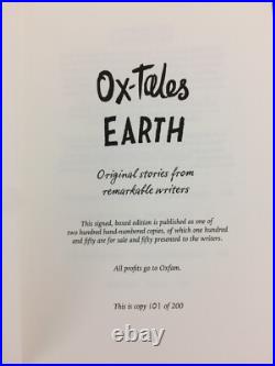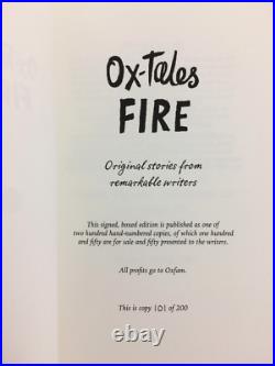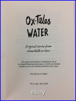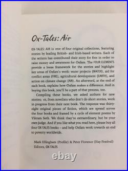 Hurtwood Press for Oxfam, London, 2009. Limited Edition Numbered 103 / 200. Hand Signed by all 38 Authors. Including Mark Haddon, Geoff Dyer, Victoria Hislop, Sebastian Faulks, John Le Carre, Xiaolu Guo, William Sutcliffe, Ali Smith, Lionel Shriver, Jeanette Winterson, Vikram Seth, David Park, Hari Kunzru, Zoe Heller, William Boyd, Michael Faber, Joanna Trollope, Giles Foden, Michael Morpurgo, Rose Tremain, Jonathan Coe, Marti Leimbach, Kate Atkinson, Ian Rankin, Marina Lewycka, Hanif Kureishi, Jonathan Buckley, Nicholas Shakespeare, Alexander McCall Smith, Helen Simpson, DBC Pierre, AL Kennedy, Kamila Shamsie, Beryl Bainbridge, Louise Welsh, Diran Adebayo, Helen Fielding. Set of Four Hardback, Cloth Covered Books. Ox-Tales Air, Ox-Tales Fire, Ox-Tales Earth, and Ox-Tales Water. Silk ribbon to each book. 200 copies printed, of which 150 were for sale, the other fifty presented to authors. Some images above are of another opened edition for reference. You will receive number 103/200, new and unused.Sealed in original publisher's paper wrap. We won't live with poverty. The proceeds will go towards our life changing work.